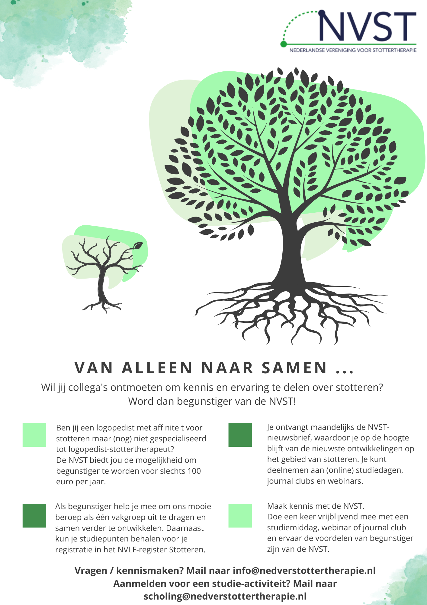 Als lid van de NVST ben je altijd op de hoogte van de laatste ontwikkelingen op het gebied van stotteren, mag je deelnemen aan een grote diversiteit van grote en kleine projecten die vanuit de NVST-teams worden aangepakt en werk je samen aan het registreren en herregistreren in het CESS-register. Daarnaast biedt het lidmaatschap van de NVST je automatisch inschrijving in het Register Stotteren van de NVLF (waardoor je code 4301 en 4309 kunt declareren). Registratie en herregistratie hoef je dan niet meer zelf te regelen. Je staat vermeld als logopedist-stottertherapeut op de therapeutenkaarten op de ,NVST-website en op www.stotteren.nl.